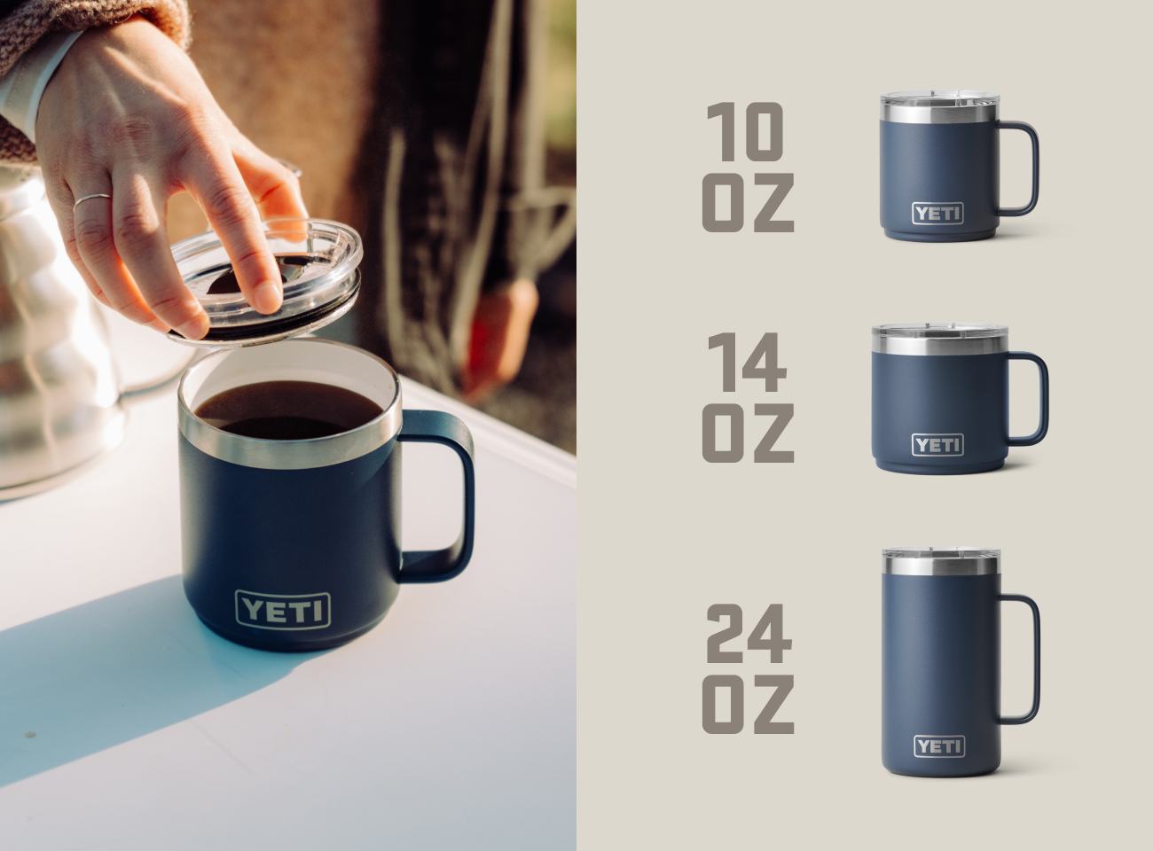 Les tasses Rambler® 10 oz (295 ml) et 14 oz (414 ml) sont conçues pour tout contenir et tout affronter. Le revêtement céramique DuraSip™ préserve un intérieur sans taches et restitue pleinement les arômes de chaque torréfaction. Chaque tasse est munie d’une isolation sous vide à double paroi pour garder votre boisson chaude, même lorsque les températures chutent. Pour les soirées autour du feu, la tasse Rambler® 24 oz (710 ml) est la chope en acier inoxydable qu’il vous faut.